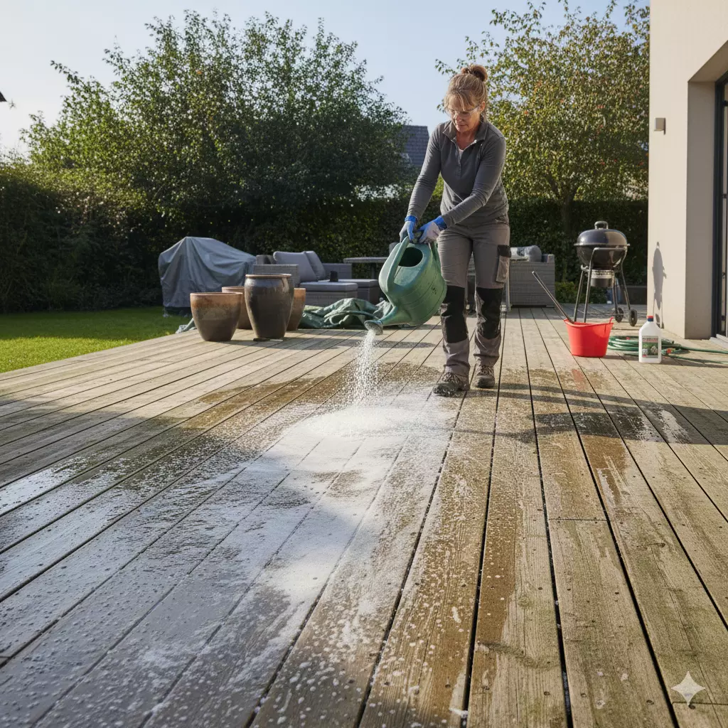 - Un produit nettoyant spécifique pour terrasse en bois (ou du savon noir, du bicarbonate de soude)