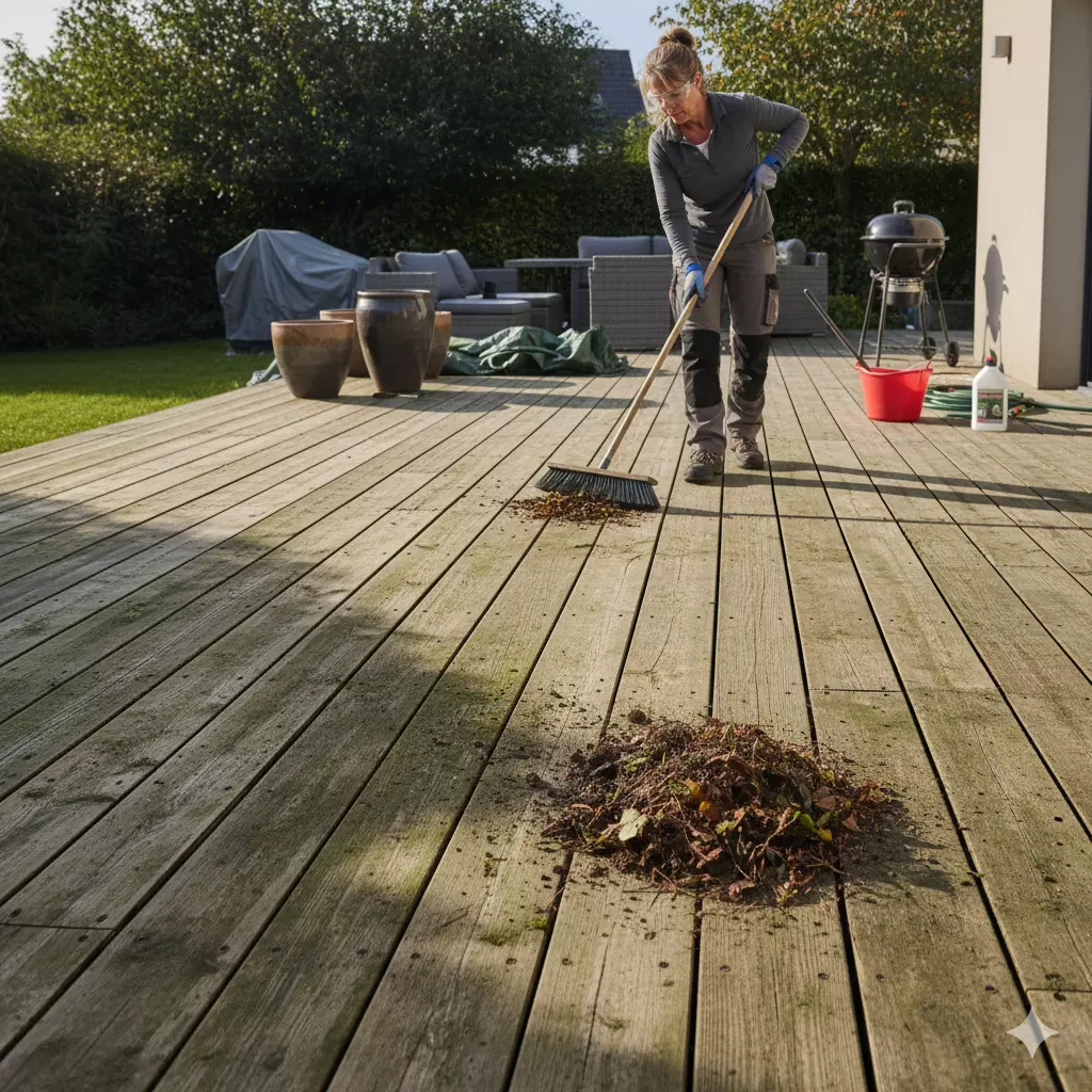 Commencez par dégager entièrement la terrasse. Retirez tous les meubles, pots de fleurs et autres objets. Balayez ensuite la surface pour éliminer les feuilles mortes, la terre et les débris grossiers.